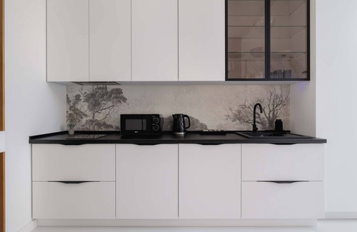 The kitchenette, decorated in a modern style with white cabinets and an elegant black countertop, is equipped with everything you need to prepare meals. Here you will find an induction hob, a fridge with a freezer, a microwave oven and an electric kettle. A set of dishes and kitchen utensils will allow you to cook your favourite meals with ease.