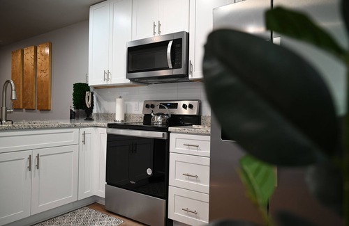 Enter a light filled open floor plan featuring a living/dining combo. Rear bedroom has ensuite bath w/ shower and two large closets. This newy renovated home includes luxury vinyl flooring throughout, new paint, new baths, new kitchen with stainless appliance package and granite counters. smart TV, SONOS sound and internet. New washer and dryer. Plenty of parking and close to major areas! Monthly cleaning is included. Come have a charming stay!
