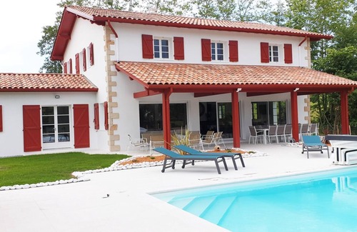 ZERUKO IZARRA is the ideal address for a comfortable stay on the Basque Coast. Ideally located, a stone's throw from the village of Sare (700m), 4 km from the Spanish border and 15km from the beaches of Saint Jean-de-Luz, this large independent house welcomes you for a holiday with family or friends. On the ground floor: entrance, large air-conditioned living room of 60m2 with lounge area (panoramic sofa, 2 Smart TVs, Bluetooth station, wifi), dining area and open kitchen (dishwasher, fridge-freezer, induction hobs, 2 pyrolysis ovens), pantry (washing machine, dryer), 2 master suites (including 1 with Smart TV) with 1 bed 160 each, private bathroom/wc (shower and bathtub). The ground floor is accessible to people with reduced mobility (shower seat and 2 suction handles available). Upstairs: 5 bedrooms including 1 with Smart TV (4 beds 160x200, 2 beds 90x200), 3 bathrooms upstairs including 2 with toilet, separate toilet. Heating and air conditioning are included in the price. Baby equipment available. Outside, you will enjoy a private heated swimming pool (4x9m, treated with salt), covered by an automated dome (open from May to September depending on weather conditions) allowing you to swim in all weather and ensuring total safety for children. A covered terrace, a private garden of 1500m2, a summer kitchen with plancha and a terrace with sun loungers are at your disposal for moments of relaxation and idleness. At the front of the house, you will have a large parking lot and a bowling alley. Room for storing bicycles (on request). A contribution to the cleaning costs of this large gîte will be requested upon arrival: to be paid on site €200 / stay Parties and evenings not permitted. Contact us for rates for 8 to 10 people